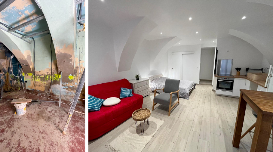 Transformation d’une cave en rez-de-jardin en un appartement de 35 m² entièrement rénové : sols refaits, isolation et placo, création d’une salle de bains et de WC, installation complète de la cuisine, rénovation de l’électricité, de la plomberie et des menuiseries, avec réalisation d’alcôves et intégration de spots encastrés.